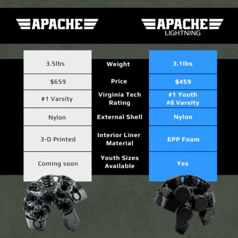Der Apache Lightning ist der leichteste College- und Jugend-Footballhelm auf dem Markt. Er lässt sich auf unter 1,4 kg einstellen und reduziert so die Helmmasse. Das ermöglicht schnellere, natürlichere Bewegungen und hilft Spielern, schneller zu reagieren und Höchstleistungen zu erbringen.